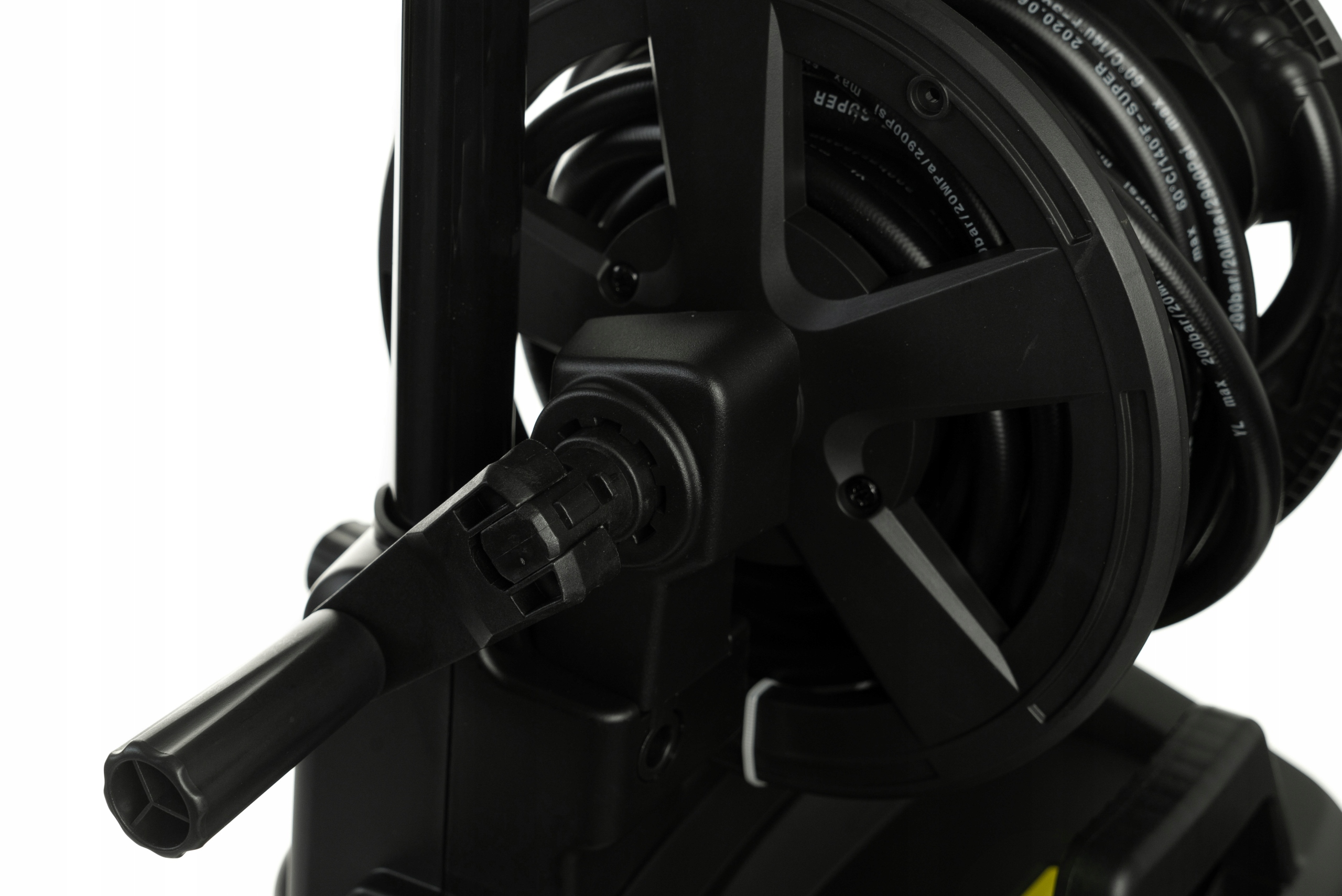 - Kołowrotek i hak – wygodne przechowywanie węża i kabla
